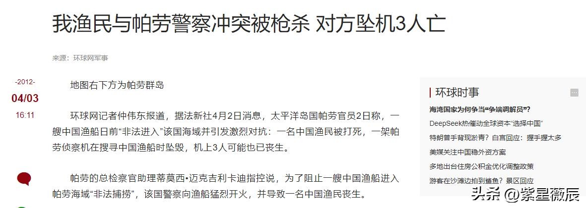 2012年,帕劳军舰以“非法捕鱼”为由扣押中国渔船,甚至开枪射杀一名中国渔民,引发中方强烈抗议。