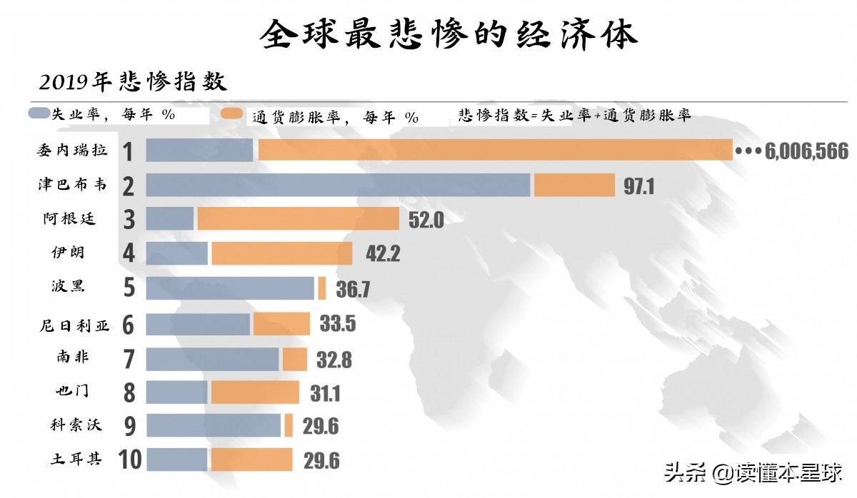 ▲委内瑞拉连续五年被评为国民悲惨率最高的国家。上图中悲惨指数的定义为:失业率+通货膨胀率=国家悲惨指数
