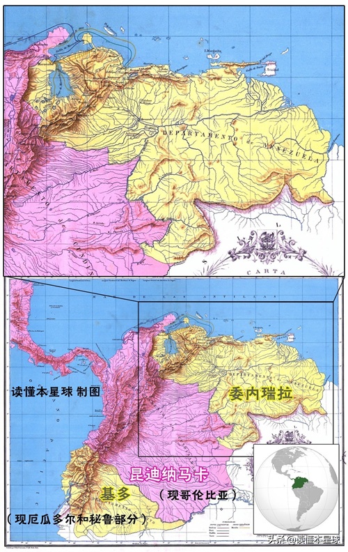 ▲委内瑞拉在大哥伦比亚共和国中的位置,当时的大哥伦比亚共和国由基多、昆迪纳马卡、委内瑞拉组成