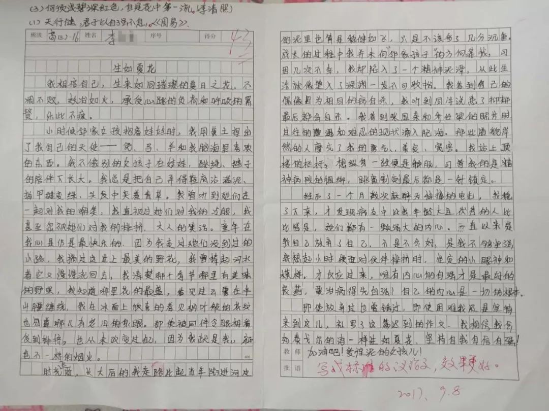 这篇描述自己惨烈精神状态的文章,最后得到43分,老师的评语是“写成标准的议论文,效果更好”。