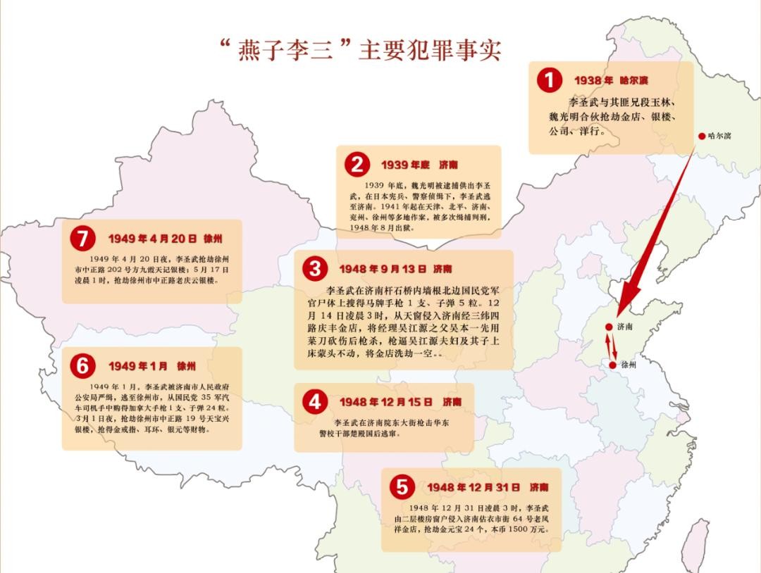 燕子李三,本名李圣武,山东禹城人。因其辈分排行老三,俗称“李三”。李三早年投奔东北土匪,在哈尔滨等地以抢劫、偷盗为生,练就了一身吃喝嫖赌、抢盗掠杀的“本领”。带着这身“本领”李圣武返回济南,他曾只身抢劫济南大公委托商行、洪顺洋服店、美最时钟表行、华成绸缎庄等巨额财产,被国民党警察逮捕入狱,但他勾结官府,向警局行贿,很快就从监狱里放出来。在当时的国民党和日伪统治时期,“燕子李三”已经是济南臭名昭著的人物了。
