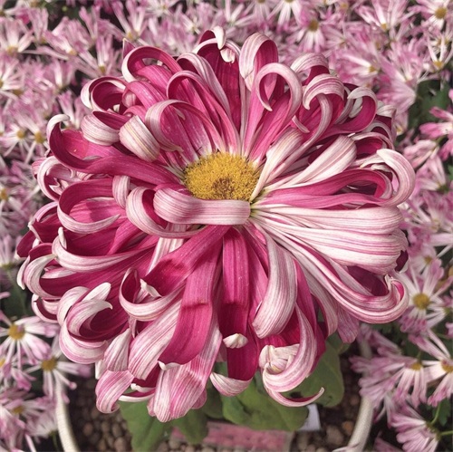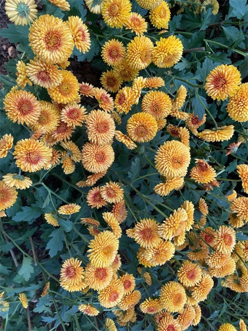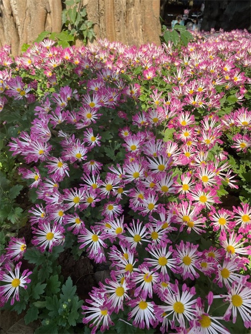 接着是红色和黄色区域,一片火热而热情洋溢。这里有各式各样的盆栽类菊花,在阳光下散发出迷人的光彩。看似简单的颜色组合却能传递出浓厚、活力四溢。