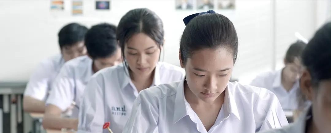 其次是空间场面调度。教室作为一个封闭的空间,很难在其中通过影像叙事,《天才枪手》却突破了这一难题。影片将现实中的动作艺术化,由影像时间去支配影像空间。