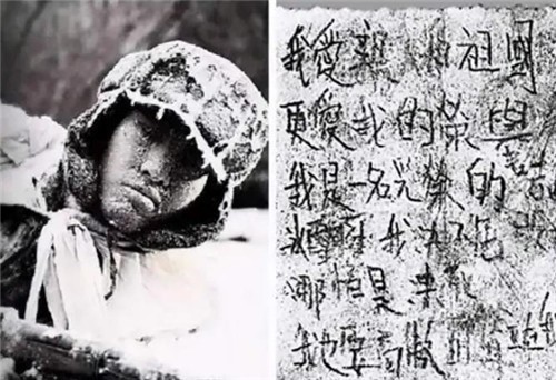 一个名叫宋阿毛的烈士写下这样的遗书:“我是一名光荣的志愿军战士,冰雪啊!我决不屈服于你,哪怕是冻死,我也要高傲地耸立在我的阵地上!