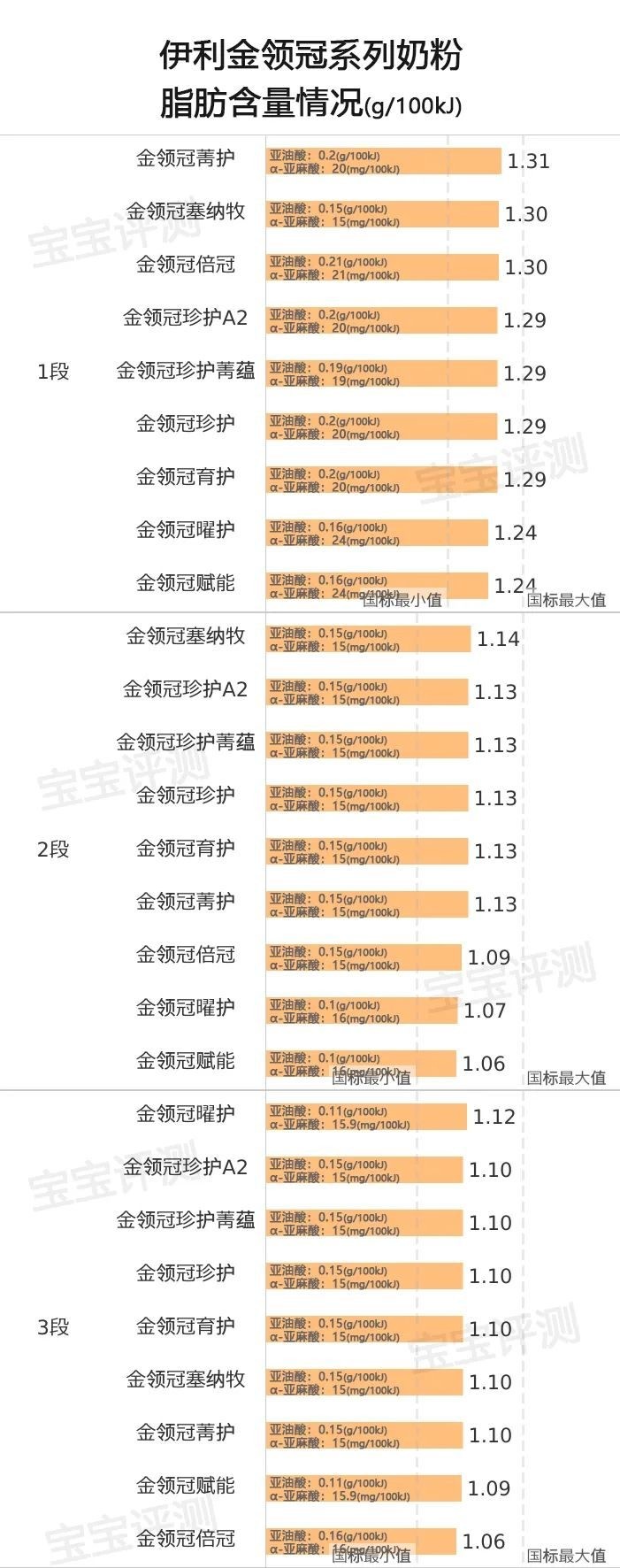 1、伊利金领冠各系列奶粉全段的脂肪含量均符合新国标要求。