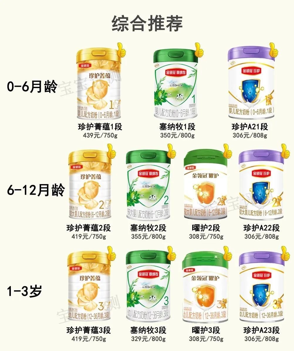 6、金领冠珍护A2、菁护、塞纳牧、倍冠、赋能,宣称采用的是A2β-酪蛋白,对消化吸收可能有一定帮助。