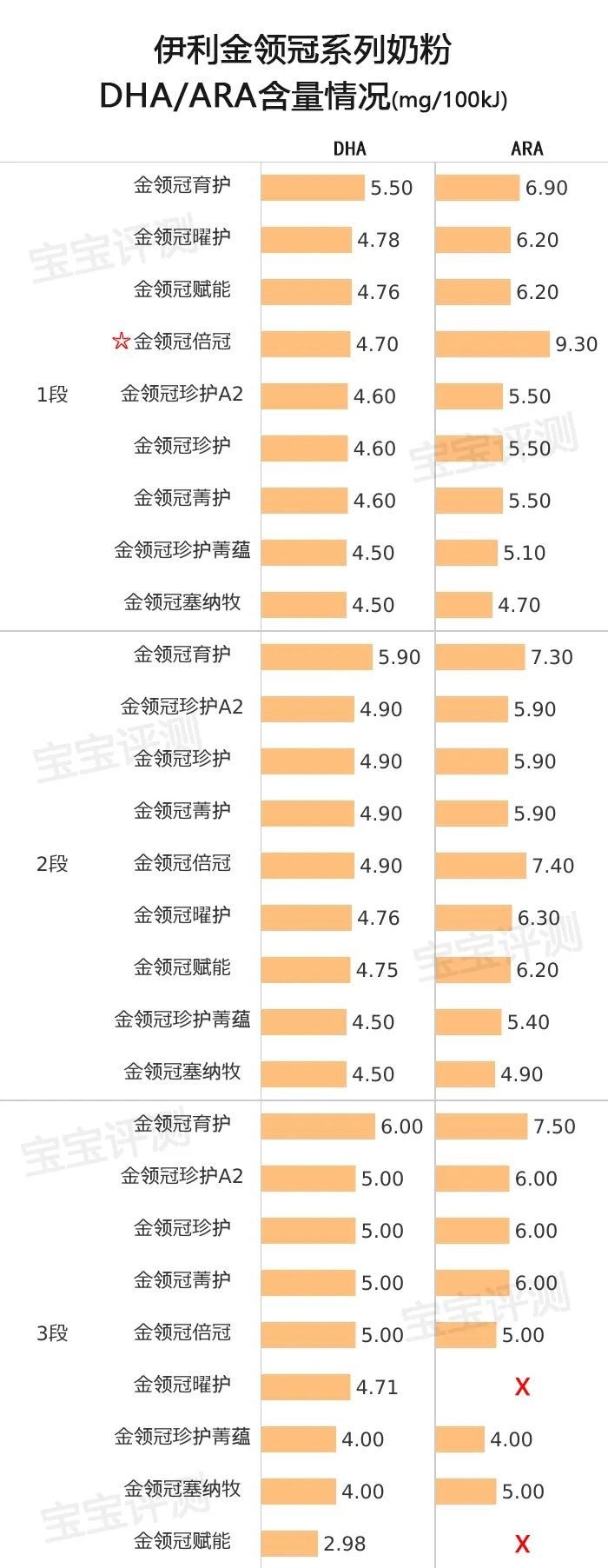 2、伊利金领冠各系列奶粉全段均添加了DHA,除金领冠曜护、赋能3段未添加ARA外,其他系列全段也都添加了ARA,而且含量均符合新国标要求。