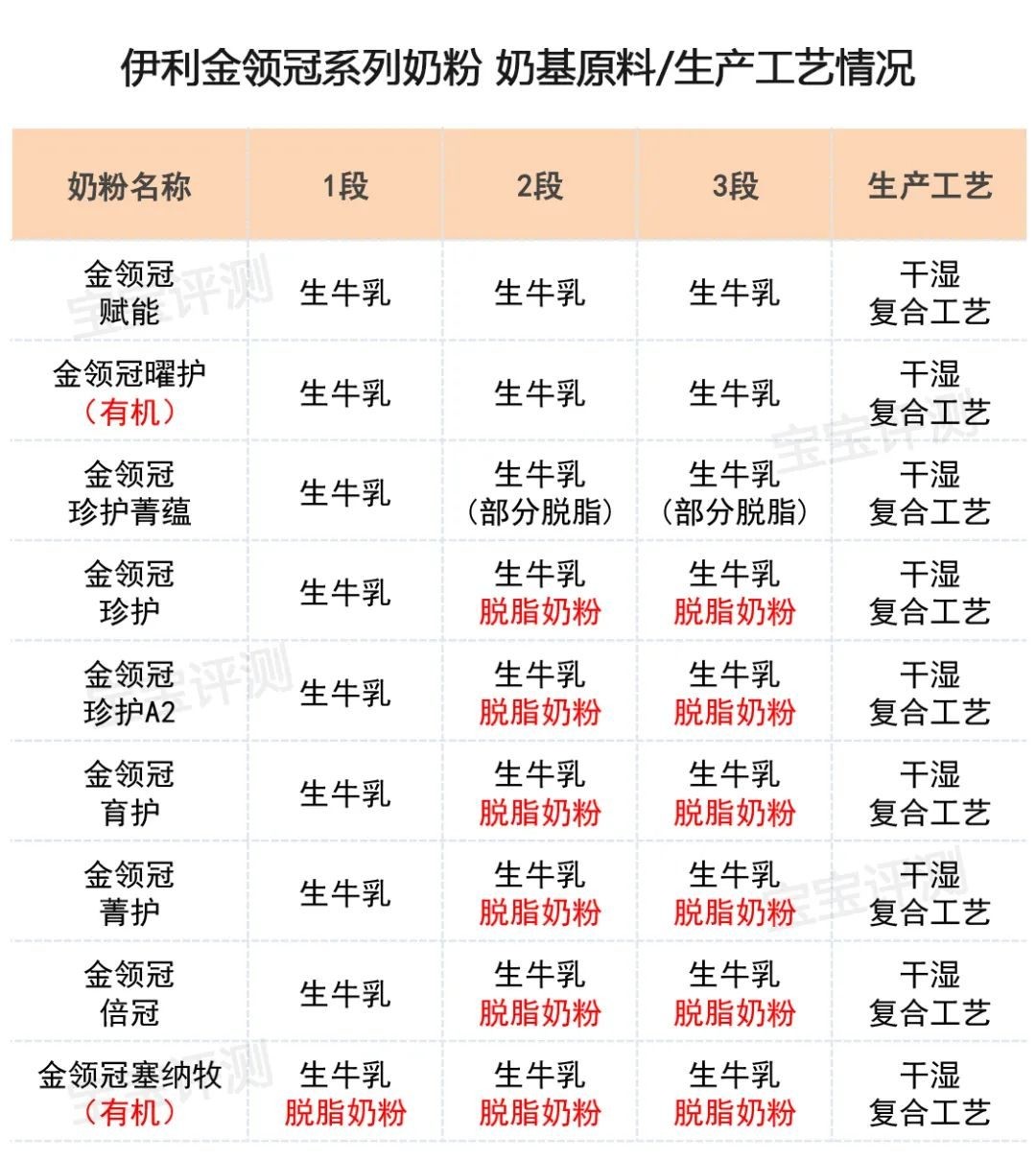 2、只有金领冠赋能、曜护、珍护菁蕴,全段均为生牛乳入料,并采用干湿复合工艺,奶基原料的新鲜度相对更优。