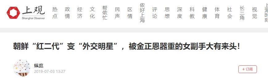 上观新闻2019-07-03发布的《朝鲜“红二代”变“外交明星”,被金正恩器重的女副手大有来头!》