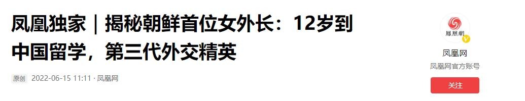 凤凰网2022-06-15发布的《凤凰独家|揭秘朝鲜首位女外长:12岁到中国留学,第三代外交精英》