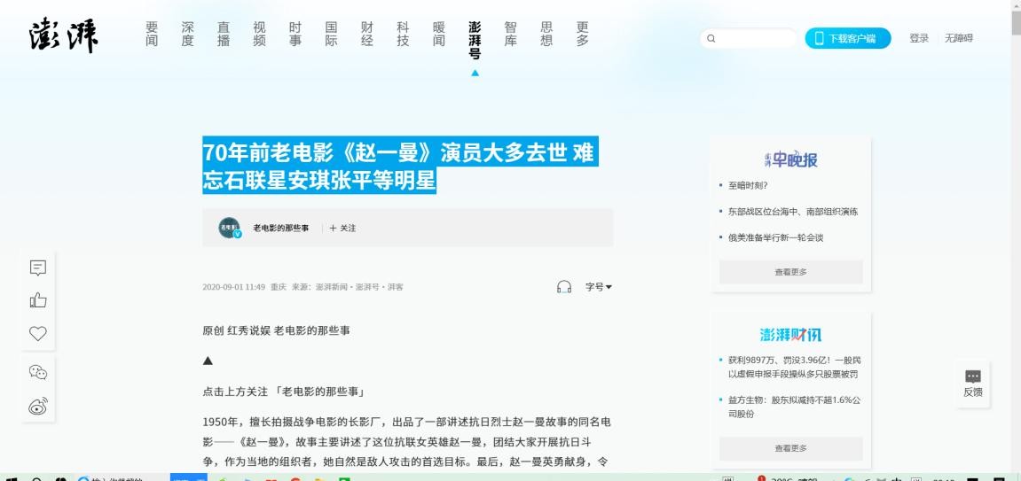 《澎湃新闻》:70年前老电影《赵一曼》演员大多去世 难忘石联星安琪张平等明星