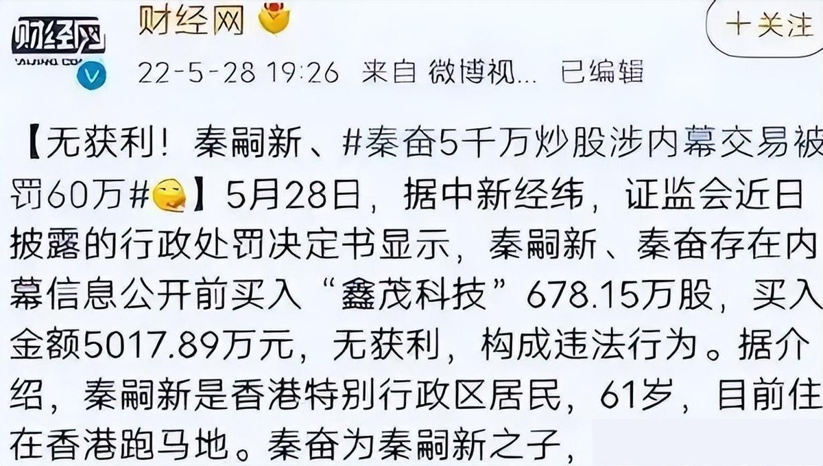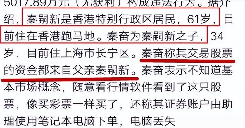 原来他父亲叫秦嗣新,因为某事被罚了60万。