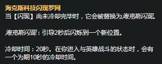 海克斯闪现与普通技能一样都有“技能”冷却时间,其冷却时间为20秒。在进入到与英雄战斗状态时,冷却时间为10秒。