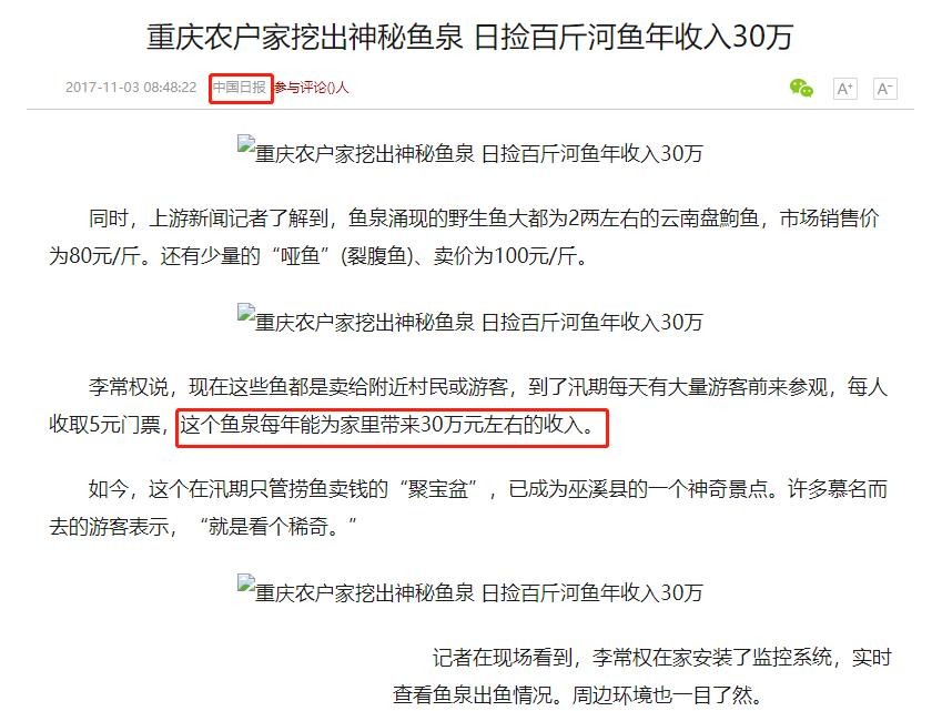 《重庆农户家挖出神秘鱼泉 日捡百斤河鱼年收入30万》中国日报2017年11月3日发布