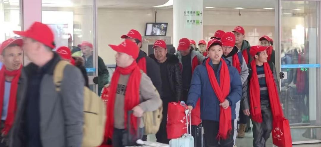 来自重庆市武隆区的45名务工人员手提“鲁渝劳务协作春风行动”红色礼包,在工作人员引导下有序登上大巴车,前往就业单位。