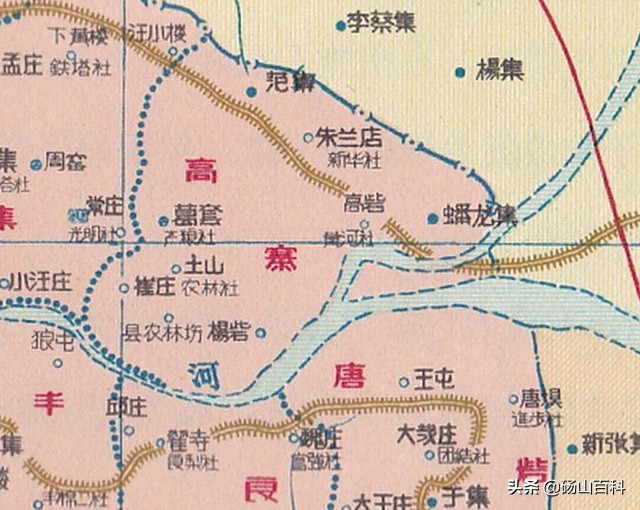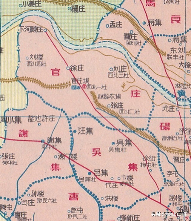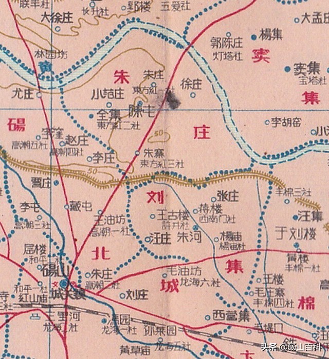 《安徽分县图》地图集的第28幅为砀山县地图,比例尺为1:30万,详细标绘了1956-1958年间砀山县的各乡界线及大量村庄地名。砀山县在这段时期的行政区划图,我还是第一次看到。不可思议的是,在该幅地图上的砀山县西北部,竟然还绘有海拔50米的等高线,看来这部地图集的编辑人员的确是走心了。但最为特别的还是图上标注了大量的“XX社”,经查县志得知,这些是已经消失了许久的“高级农业生产合作社”的名称。