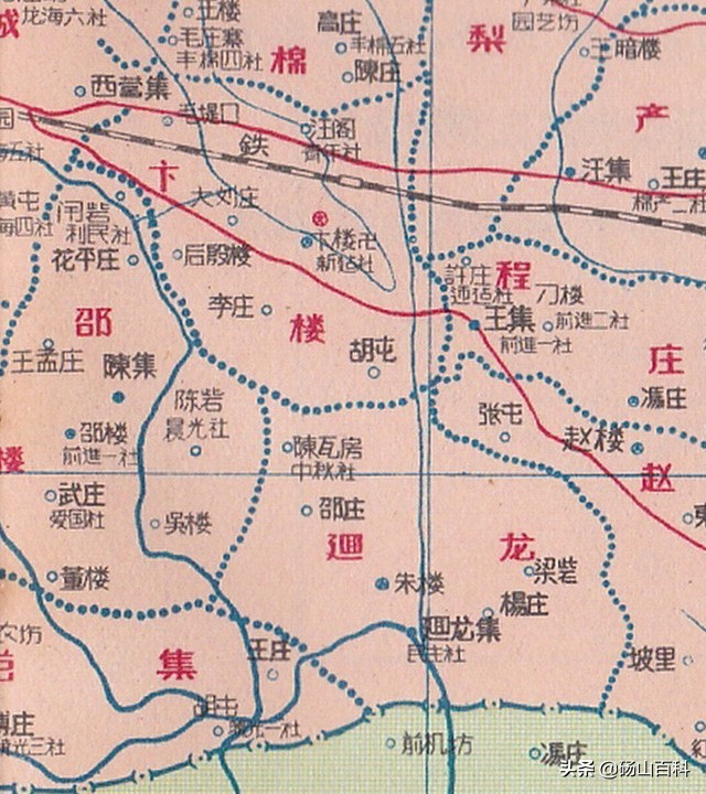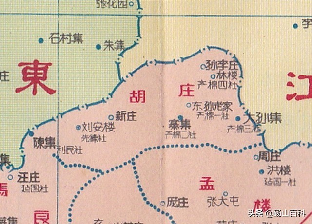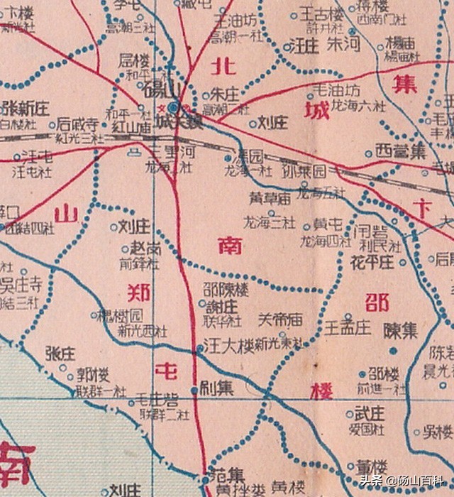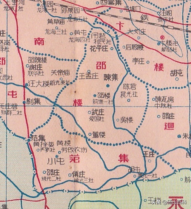 再回到这幅砀山县地图,因图幅大小所限,在图上仅标出172个高级社中的107个,这算是个遗憾吧。由于当时文字的简化尚未定型,图上文字繁、简、俗并存,很具时代特色。为了方便详细观览此幅地图,下面按乡分别截图解读。图上一些地名的错误之处,我直接在下文中有修正,不再单独行文指出。