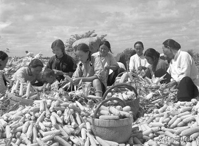 1955年,砀山县城南乡陇海农业生产合作社的社员正在收获玉米。(新华社 丁峻摄影)