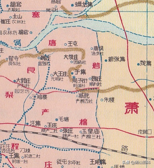 那什么是“高级农业生产合作社”呢?这就要稍微扯远一些了。拿我们砀山县来说,解放以后,在农村先是搞土地改革,划定阶级成分,均分土地。之后成立了互助组,再试办初级农业生产合作社,又发展到高级农业生产合作社。到了1957年,全县共有高级社172个,有近97%的农民参加。在这期间的1956年3月,砀山县还进行一次“撤区并乡”的行政区划调整,成立了26个乡和城关镇。上述的这些也就是这幅砀山县地图的内容概况。