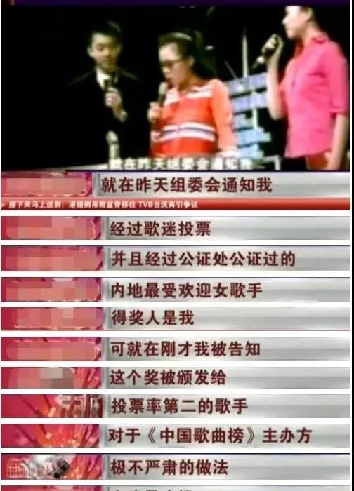 于是就有了“中国流行歌曲榜”颁奖典礼上,她摔话筒的事情。