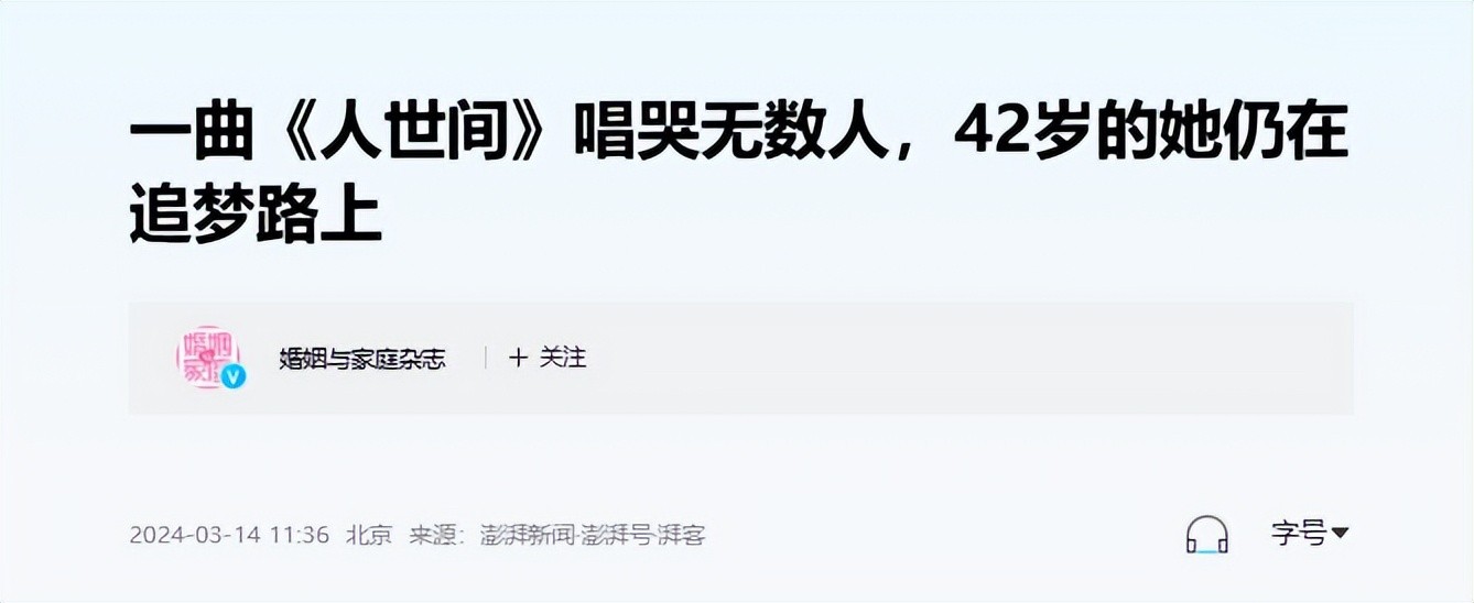 澎湃新闻2024-03-14:一曲《人世间》唱哭无数人,42岁的她仍在追梦路上