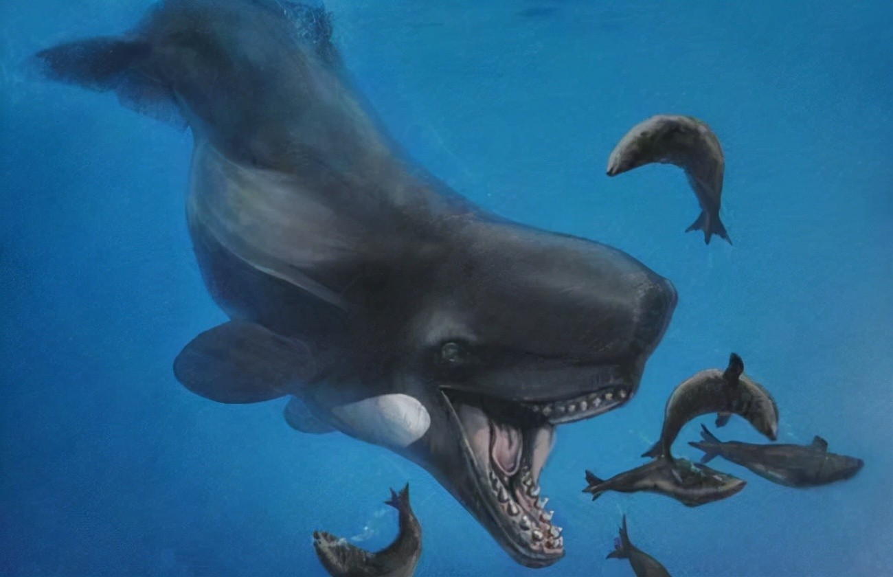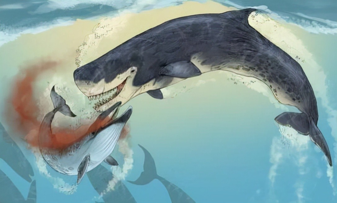 属于抹香鲸类,一条梅尔维尔鲸差不多有17米以上的长度,重达65吨,且最大牙齿长达35厘米,是海洋中的顶级捕猎者。