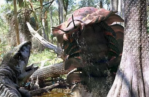 用利剑般的爪子狠撕猎物,其它陆生物种,见了棘龙都惊恐地闪躲起来,妥妥的水陆老大。