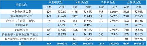 截至2022年 8月 31日,毕业生协议和合同就业率 37.68%、升学率(含出国、出境)16.35%、灵活就业率 28.65%、自主创业率 0.26%。其中,毕业研究生协议和合同就业率 70.96%、升学率(含出国、出境)3.68%、灵活就业率12.88%、自主创业率0.20%;本科毕业生协议和合同就业率 37.04%、升学率(含出国、出境)14.96%、灵活就业率 30.36%、自主创业率0.32%;专科毕业生协议和合同就业率 26.25%、升学率(含出国、出境)27.91%、灵活就业率 27.91%。