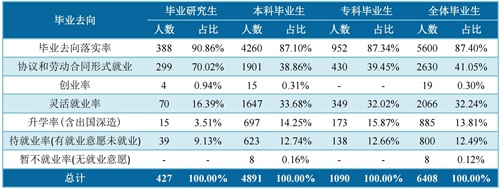 截至2021年8 月 31 日,2021 届毕业生中,协议和劳动合同形式就业率为 41.05%、创业率为 0.3%、灵活就业率为 32.24%、升学率(含出国深造)为 13.81%。分学历来看,毕业研究生中,协议和劳动合同形式就业率为 70.02%、创业率为 0.94%、灵活就业率为 16.39%、升学率(含出国深造)为 3.51%;本科毕业生中,协议和劳动合同形式就业率为 38.86%、创业率为 0.31%、灵活就业率为 33.68%、升学率(含出国深造)为14.25%;专科毕业生中,协议和劳动合同形式就业率为 39.45%、灵活就业率为 32.02%、升学率(含出国深造)为 15.87%。