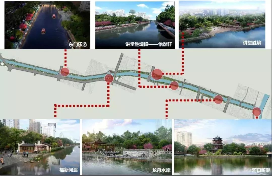 讲堂胜境、龙舟水岸、河口听潮等节点