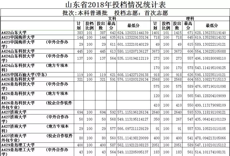 山东省2018年投档情况统计表