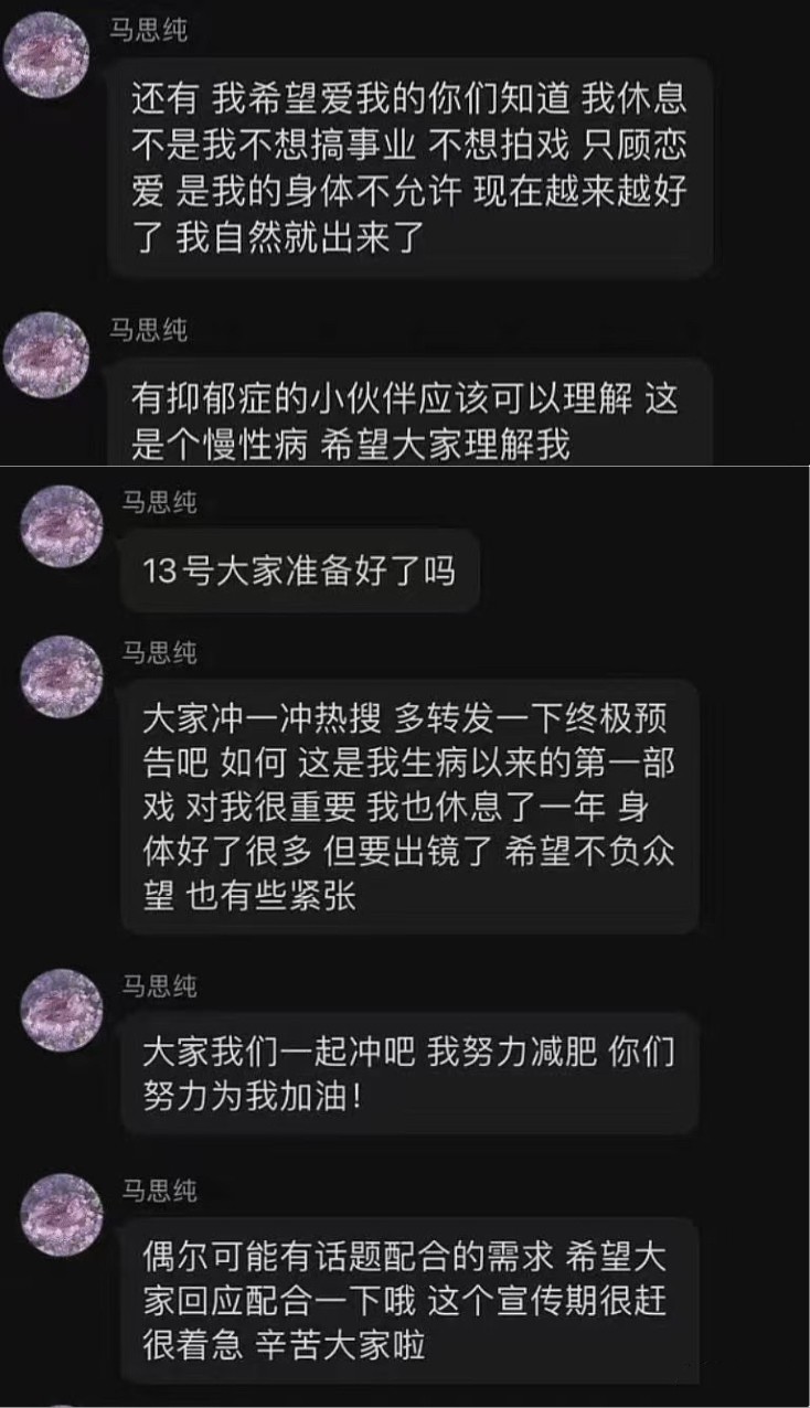 马思纯这次为电影宣传时,特意到粉丝群号召粉丝一起加油,也谈到了自己这8个月未公开工作的原因,马思纯表示这是她生病以来的第一部戏,希望粉丝多多支持。她说自己休息了1年时间不是不想搞事业,而是抑郁症的情况不允许。
