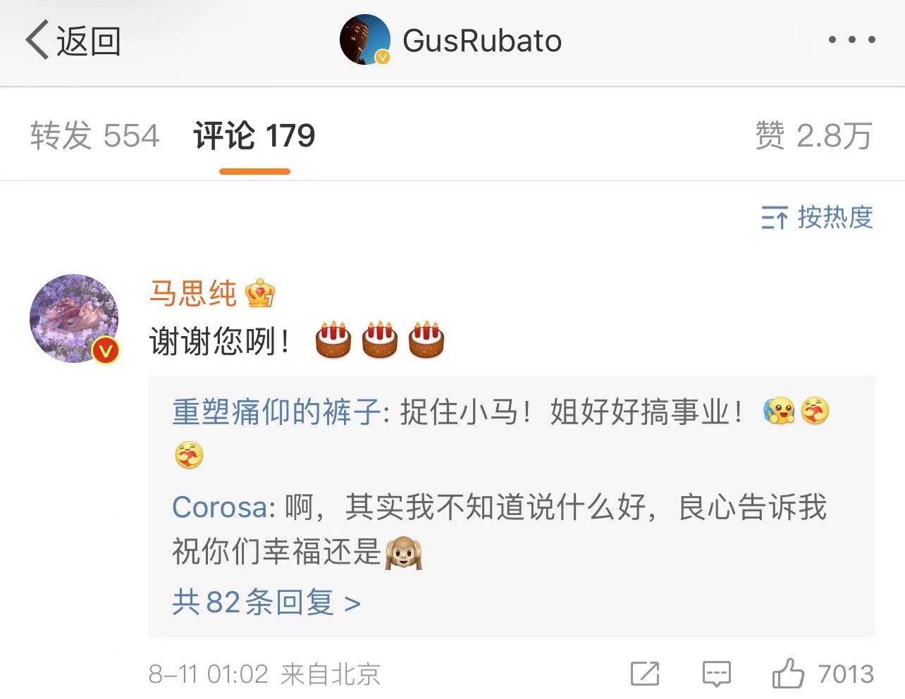凌晨,张哲轩晒出一张自己对着镜子剃胡须的照片,还赤裸着上半身,配文是——而立,感谢陪伴,祝摄影师电影票房大卖。马思纯在下方留言:“谢谢您咧!”还配上了3个蛋糕的表情,这样看来,照片就是女友马思纯拍摄的,所以称呼摄影师。