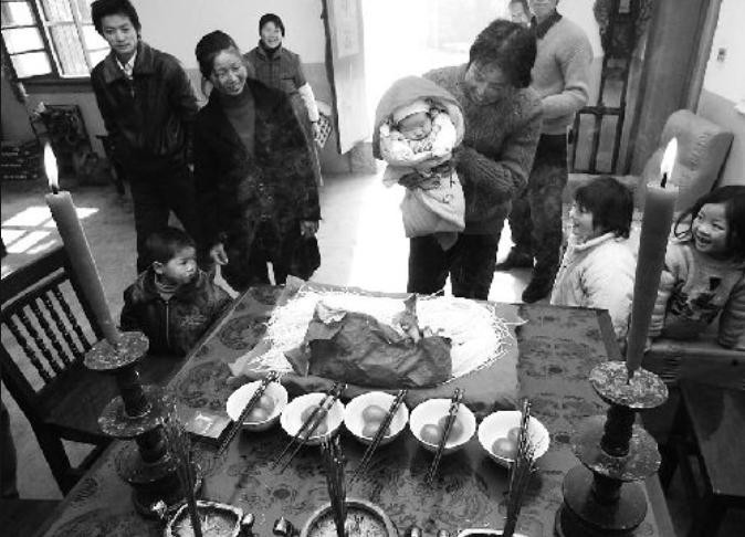 拿起秤砣比划比划,寓意孩子将来能像秤砣一样,有举足轻重的地位;拿起锁头比划比划,寓意孩子将来能手紧脚紧,稳重谨慎;拿上金银放在孩子身上,寓意孩子将来财运兴旺;用烘笼筛纸花,孩子不出天花,健康长大;最后,给孩子喝一口大黄熬的,寓意:“三日尝得黄连苦,终身富贵不受穷”