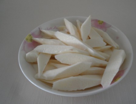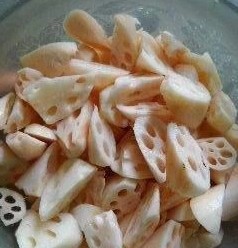 4、把长山药与莲菜洗净,山药切成滚刀形状,莲菜切成半月片。