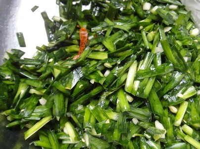 6、吃时把肉与长山药和莲菜分四等份,盛在碗中,加点羊尾巴油丁,灌上糊汤,配上腌韭菜即可。