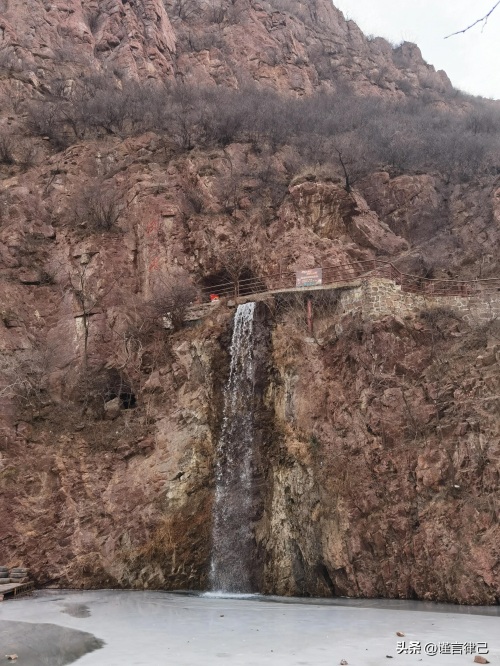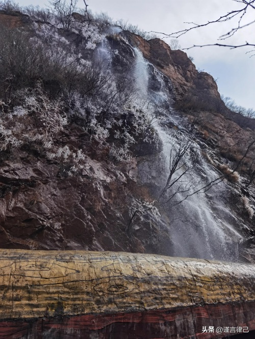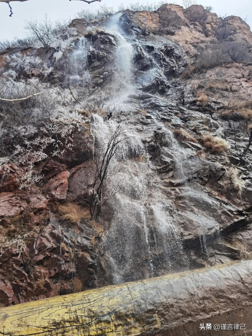 一泉飞瀑从半空中飞流而下,颇有疑是银行落九天的壮观和豪迈。由于天气寒冷,飞溅的水滴落在旁边的树枝上,很有种冰树银花的感觉,在阳光照射下闪闪发光。