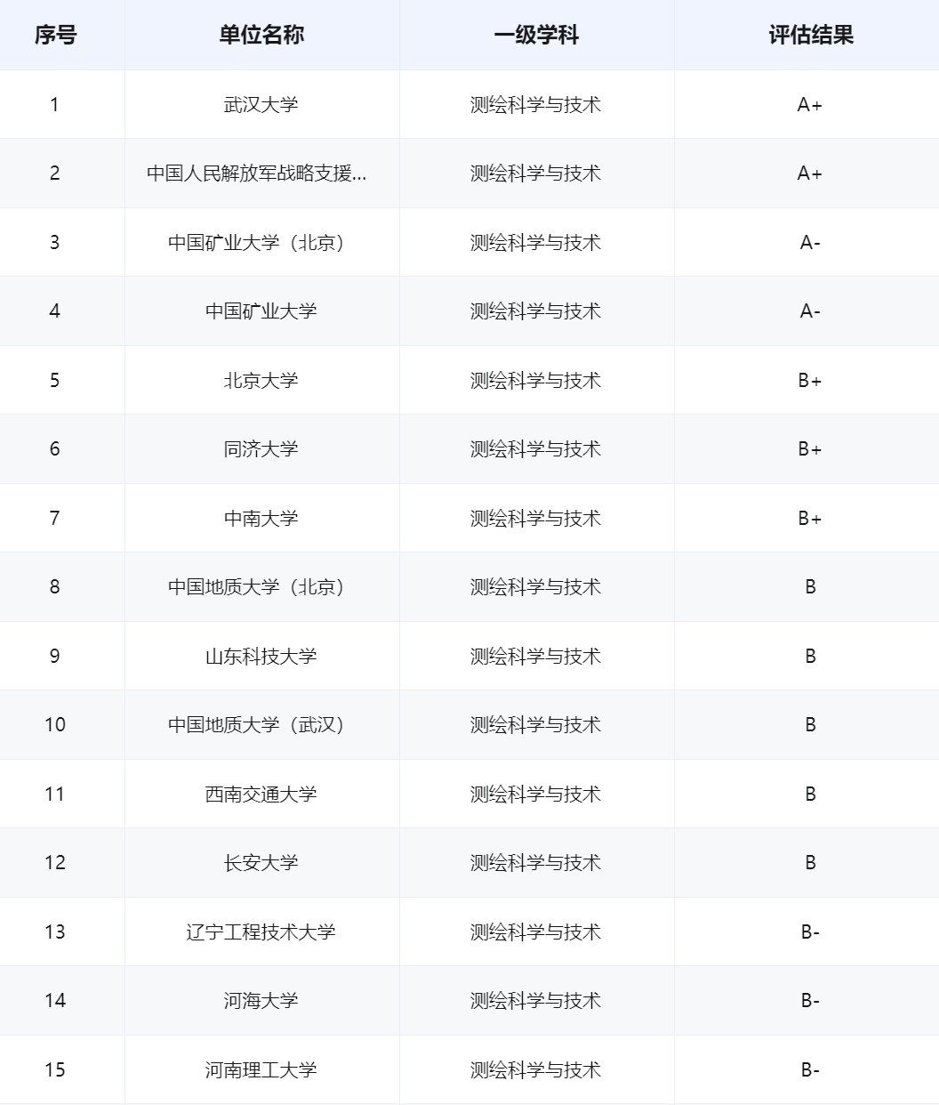 由于第五轮学科评估没有公布最终结果,这里我们姑且以第四轮学科评估的结果作为参考,来看看各大院校在测绘学科的实力。在第四轮学科评估中,获评A级的院校有4所,其中武大、军信大为最好的A+,中国矿大、中国矿大(北京)为A-;北大、同济、中南大学等3所院校紧随其后,获评B+;山东科大、中国地大(武汉)、西南交大、长安大学为B;辽宁工大、河海大学和河南理工大学为B-。此外,东北大学等11所院校获评C级。