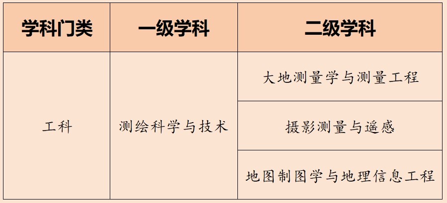 按照现有的学科分类,测绘科学与技术学科为工科门类下的一级学科,下面设置了大地测量学与测量工程、摄影测量与遥感、地图制图学与地理信息工程等3个二级学科。