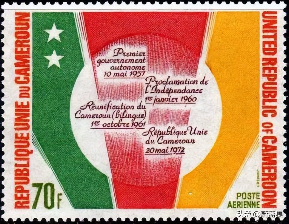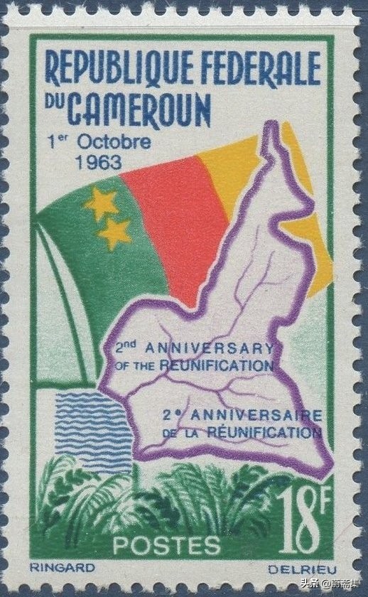 上图为喀麦隆1963年发行的纪念统一2周年邮票,为喀麦隆版图及国旗。