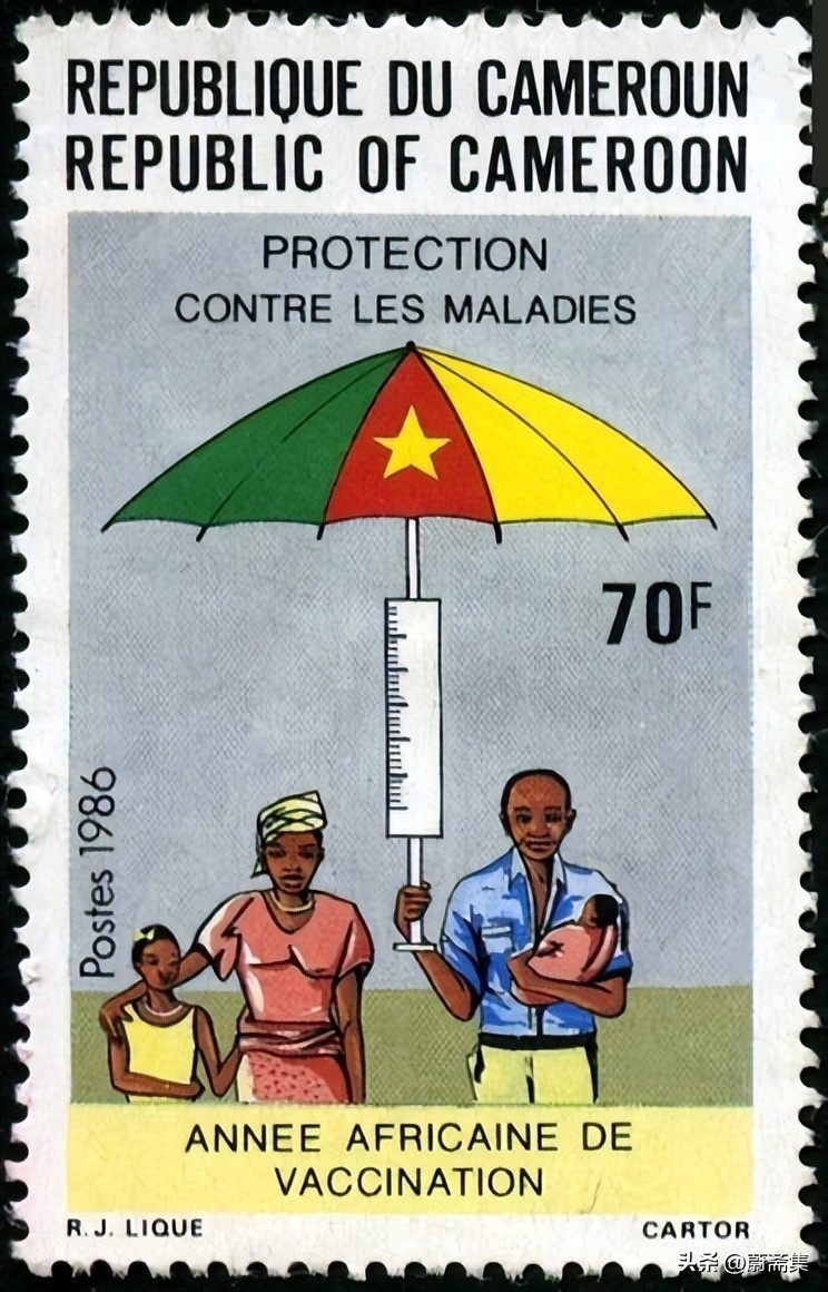 从19年世纪末正式开始疫苗接种开始,人类因传统病而丧生或致残的数量大幅下降,特别是新生儿及儿童,提高了人类的生存质量。1986年是非洲接种疫苗年(African Vaccination Day),为此,喀麦隆发行了纪念邮票,喀麦隆国旗化为一把守护家庭与国民的大伞。