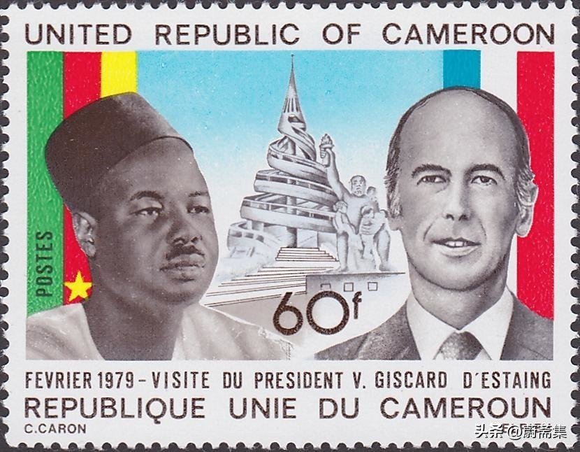 1979年,时任法国总统德斯坦(Valéry Giscard d'Estaing, 1926-2020)访问喀麦隆。上图为纪念邮票,当时的喀麦隆总统仍然是阿希乔,邮票中间的建筑为独立纪念碑。