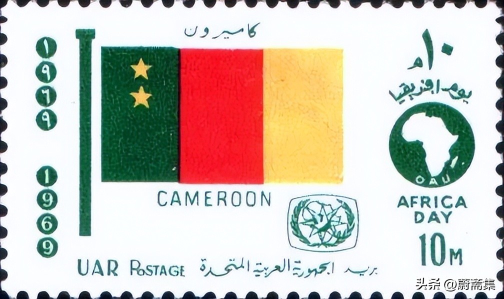 非洲统一组织(OUA-OFU)成立于1963年5月25日,这一天也被称为非洲日。作为非洲国家,喀麦隆自然为是非洲统一组织(今非洲联盟)的成员。上图为埃及(当时称阿拉伯联合共和国)发行了非洲日邮票,该组邮票的图案为当时各成员国国旗。