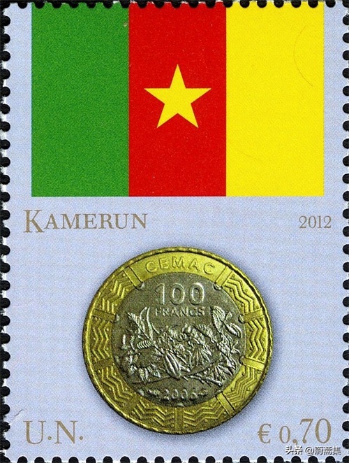 2010年联合国发行的喀麦隆国旗与硬币邮票采用的是面值100中非法郎的硬币,图案为可可果。