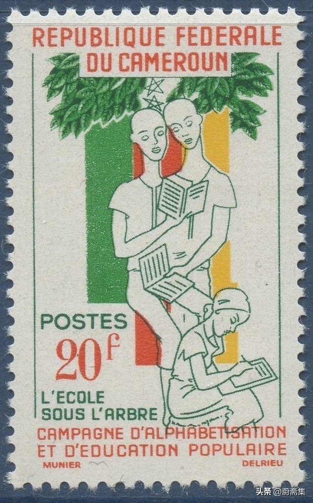 跟我们刚建国时一样,独立后的喀麦隆经济与社会发展基础十分薄弱,提高人民的文化水平是重中之重,首要的就是识字扫盲。1962年,喀麦隆即发行了扫盲与大众教育运动邮票,国旗下的年轮在努力学习识字。