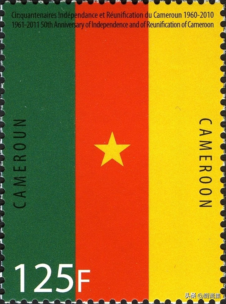 上图为2010年,喀麦隆纪念独立50周年发行的国旗邮票。