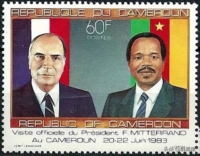 喀麦隆在1985年再次发行了法国总统访问喀麦隆的纪念邮票,图案为时任法国总统密特朗(François Mitterrand, 1916-1996)和喀麦隆新总统保罗·比亚。