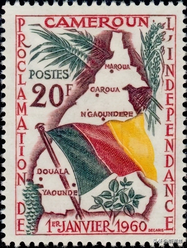 喀麦隆自治政府在1960年1月1月正式独立,上图为发行的独立纪念邮票,图案为喀麦隆国旗与喀麦隆版图,喀麦隆在独立后数次发行国旗与版图图案的纪念邮票。