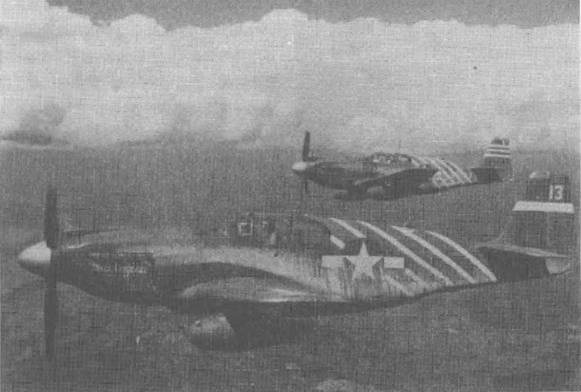 (上图)美军第10航空队第1飞行突击大队长菲尔·科克伦上校(前方编号13号的驾驶员)正在驾驶P-51“野马”式战斗机执行支援“钦迪特”部队的飞行任务。