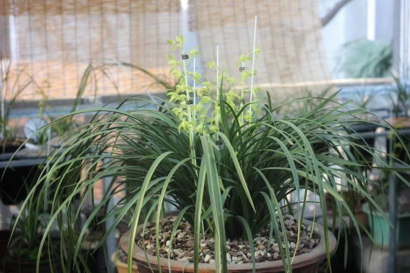 蕙之美在于势,势是一种基于正格瓣形的变化,与正格花相比,这种变化更富有感染力,利于意境、意念的表达。势是一种造型和构图,花、叶、盆搭配,排铃与转茎,曲径通幽,完成构图与造型,最后露脸,面容(瓣形)变化,构成情感表达。一连串的造型和布局,一连串的亭台轩榭,一连串的人物造型般展现出来,中宫犹如人之面容,外瓣如人之气概与举止,面容之动,举手投足,生情并茂!所以说,蕙兰犹如一场话剧,比内心独白的春兰更具感染力。